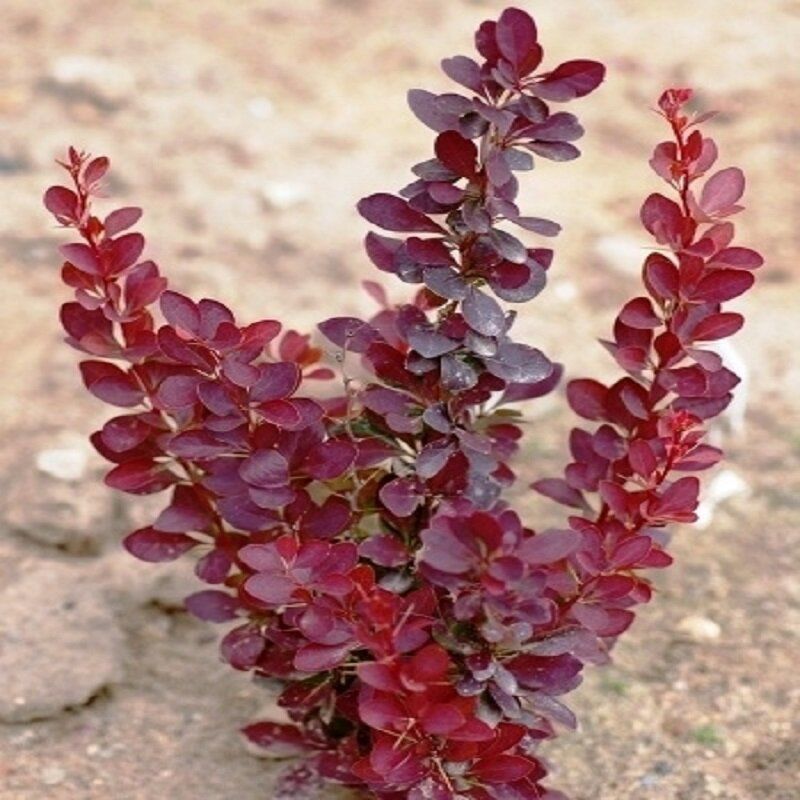 Барбарис «Ред рокет» - высокорослый колоновидный кустарник. Во взрослом возрасте достигает около 2 м в высоту. Листья пурпурного оттенка, крупные, вытянутой формы. Цветет в мае-июне.