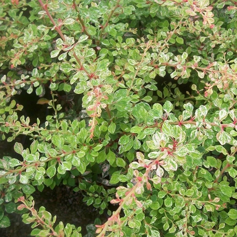 Барбарис Тунберга Старбест (Berberis thunbergii Starburst) — живописный листопадный кустарник, который ценится за необыкновенную пеструю окраску листвы, создающую эффект искрящегося фейерверка в саду. Этот сорт формирует компактную, округлую крону высотой и диаметром 50–60 см. Побеги прямостоячие, густо разветвленные, с характерными для барбариса тонкими колючками. Листья мелкие, лопатчатые. Их окраска – главное достоинство сорта: на одном кусте одновременно сочетаются ярко-розовые, сливочно-белые и насыщенно-зеленые оттенки. Молодой прирост часто имеет розово-коралловый цвет, а зрелые листья покрыты эффектным мраморным рисунком из бело-кремовых и зеленых пятен и мазков. Осенью палитра меняется на розово-пурпурные и алые тона. Цветение в конце весны скромное: мелкие желтоватые цветки с красным оттенком. Осенью могут созревать овальные красные ягоды, дополняющие осеннюю декоративность.