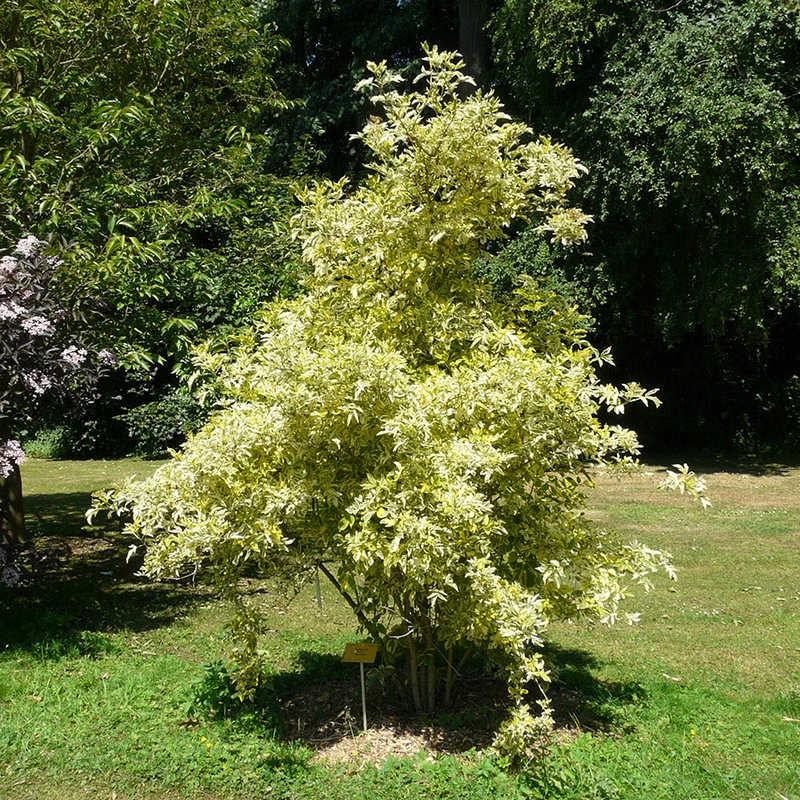 Бузина черная «Мадонна» – популярный декоративный сорт бузины, который высоко ценится за нарядную золотисто-пеструю листву и изящную форму куста. Это листопадный кустарник, достигающий во взрослом состоянии высоты 4 м при диаметре кроны 1,5-2 м, образуя округлую, раскидистую форму. Листья крупные, сложные, непарноперистые, золотисто-желтые с неравномерной зеленой каймой и мраморным рисунком. Цветки мелкие, кремово-белые, собраны в крупные щитковидные соцветия, обладают характерным ароматом. Плоды черные, блестящие, созревают в августе-сентябре.