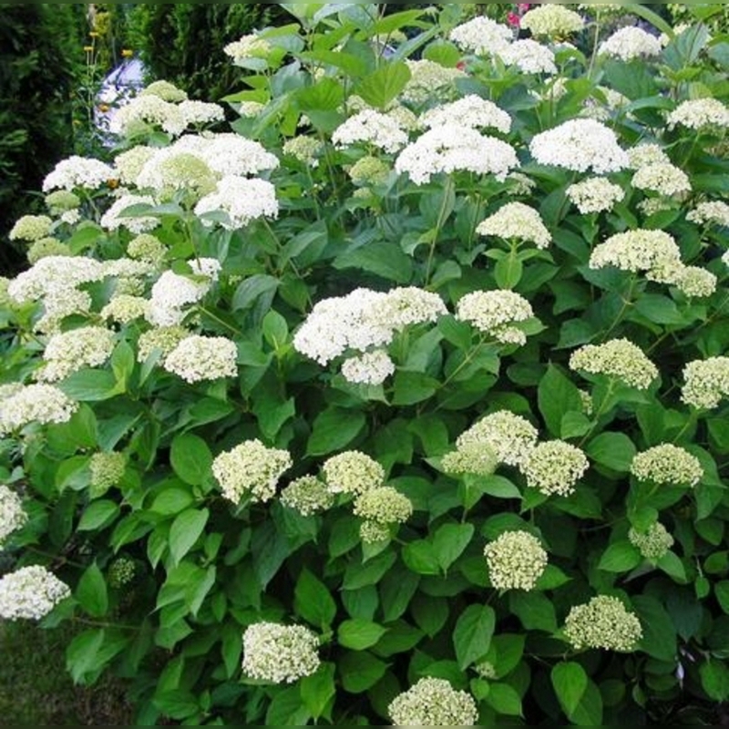 Гортензия древовидная «Вайт Дом» (Hydrangea arborescens White Dome) – эффектный и декоративный кустарник, который ценится за крупные ажурные соцветия и изящную форму кроны. Это многолетнее растение достигает высоты 1,5-1,7 м при диаметре кроны до 1,5 м. Куст формируется плотный, раскидистый, с крепкими прямыми побегами, которые не поникают под тяжестью соцветий. Листья крупные, яйцевидные, насыщенного зеленого цвета с зубчатым краем. Главная особенность сорта – крупные щитковидные соцветия диаметром 15-20 см, состоящие из мелких фертильных цветков в центре и крупных стерильных по краям. Стерильные цветки чисто-белые, сохраняют декоративность с июня по сентябрь.