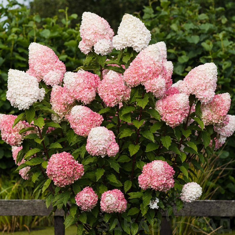Гортензия метельчатая «Пинк Энд Роуз» (Hydrangea paniculata Pink and Rose) – популярный декоративный сорт гортензии, который высоко ценится за необычную двухцветную окраску соцветий и продолжительное цветение. Это листопадный кустарник, достигающий во взрослом состоянии высоты 1-1,3 м при диаметре кроны 1,2-1,5 м, образуя раскидистую, округлую форму. Соцветия крупные (длиной 25-30 см), конические, плотные, состоящие из многочисленных стерильных цветков, которые меняют окраску в течение сезона – от кремово-белых с зеленоватыми кончиками в начале цветения до нежно-розовых с насыщенными розово-малиновыми краями в полном роспуске. Листья темно-зеленые, яйцевидной формы, с бархатистой поверхностью, осенью приобретают пурпурные оттенки.