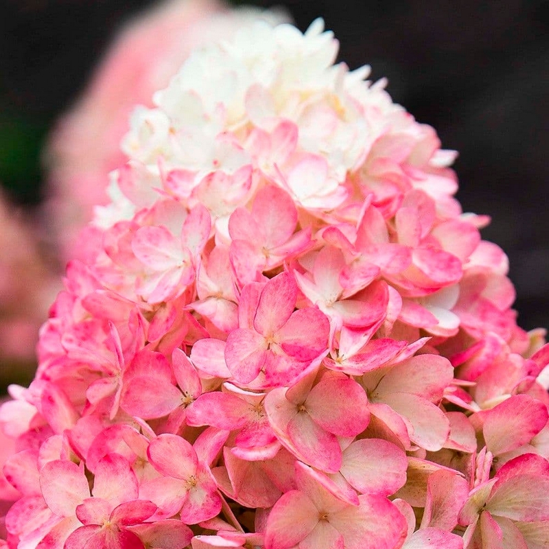 Гортензия метельчатая «Распберри Пинк» (Raspberry Pink) – популярный декоративный сорт гортензии, который высоко ценится за крупные соцветия с насыщенной малиново-розовой окраской и продолжительное цветение. Это листопадный кустарник, достигающий во взрослом состоянии высоты 1 м при диаметре кроны 1,2-1,5 м, образуя округлую, компактную форму. Соцветия крупные (длиной 25-30 см), конические, плотные, состоящие из многочисленных стерильных цветков, которые меняют окраску в течение сезона – от бело-кремовых в начале цветения до интенсивных малиново-розовых тонов в конце лета. Листья темно-зеленые, яйцевидной формы, с бархатистой поверхностью, осенью приобретают пурпурные оттенки.