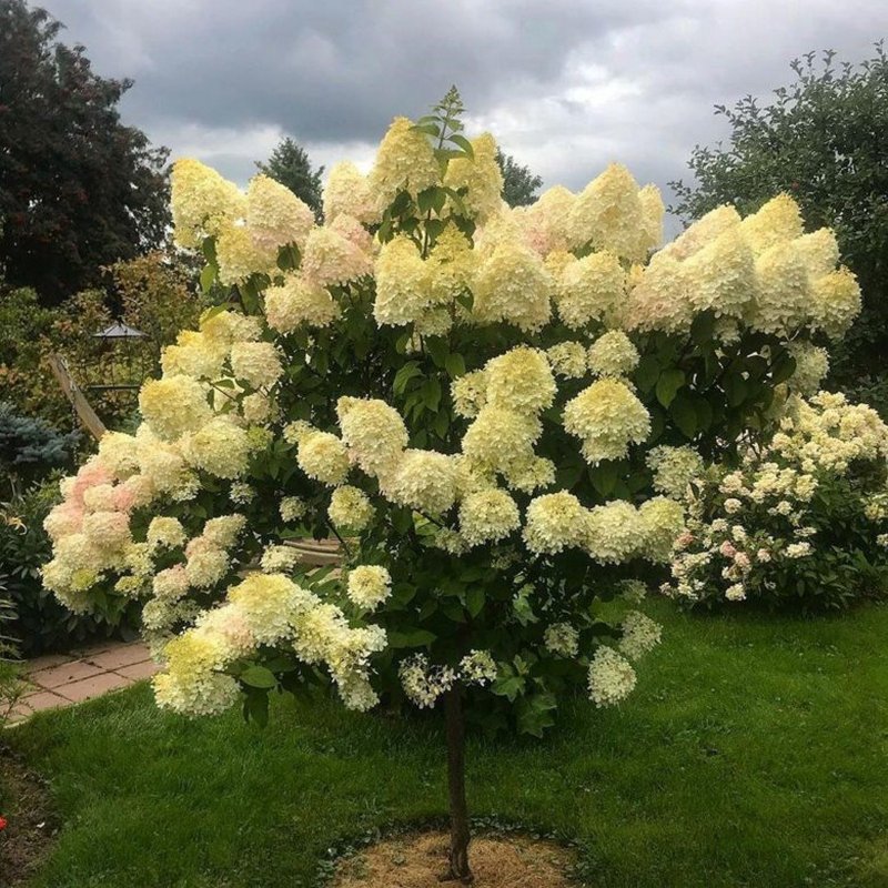 Гортензия метельчатая «Лайм Лайт» (Hydrangea paniculata «Limelight») - это декоративный куст с эффектными крупными соцветиями, сформированный на штамбе. Крона гортензии округлая и густо покрыта крупными соцветиями. Соцветия имеют форму плотной пирамиды и достигают в длину 25-30 см. Зеленовато-белые соцветия по мере созревания приобретают более светлый кремовый оттенок, а к осени могут становиться слегка розоватыми. Листья растения тёмно-зелёные, овальные, густо покрывают крону.