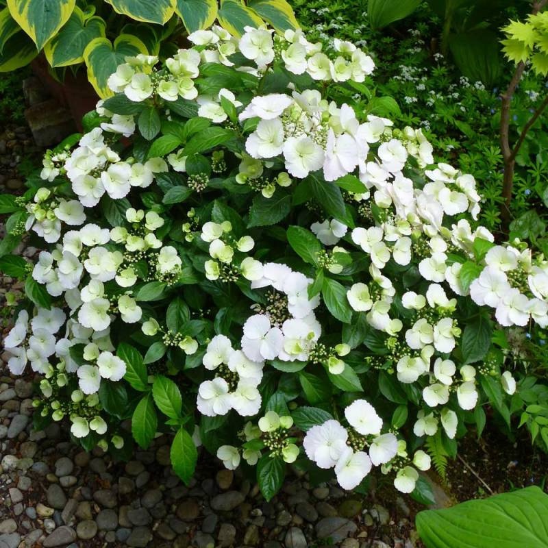 Гортензия «Сбежавшая невеста» (Hydrangea Runaway Bride) – изысканный сорт гортензии, который ценится за невероятно обильное и продолжительное цветение, а также изящную каскадную форму куста. Это листопадный кустарник, достигающий высоты 50-60 см с живописно поникающими побегами, образующими цветочный каскад длиной до 1,5 м. Листья яйцевидные, темно-зеленые, с пильчатым краем, создающие идеальный фон для многочисленных соцветий. Главная особенность сорта – обильное образование цветков не только на концах, но и по всей длине побегов. Чисто-белые стерильные цветки собраны в изящные ажурные соцветия диаметром 15-20 см, которые постепенно приобретают нежно-розовый оттенок к концу сезона. Цветение продолжается с июня по сентябрь.