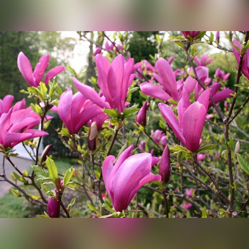 Магнолия «Сьюзан» - это декоративный гибридный кустарник или небольшое дерево, отличающееся своими эффектными крупными цветами и компактным размером. Растение достигает 2-3 м в высоту и имеет густую, округлую крону с вертикально растущими ветвями. Листья у магнолии «Сьюзан» крупные, овальные, тёмно-зелёные, с глянцевой поверхностью, придающей растению декоративность на протяжении всего вегетационного периода.