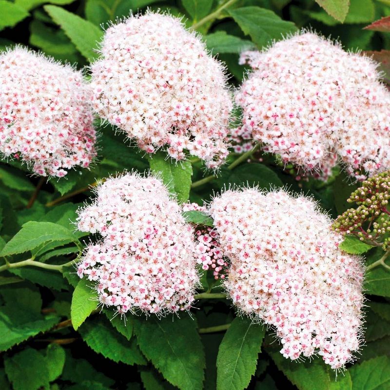 Спирея Фрейча (Spiraea x freyniana) - это декоративный листопадный кустарник, который известен своей густой, шаровидной кроной и обильным цветением. Кустарник достигает в высоту до 1,5 м в ширину до 2 м. Листья у растения мелкие, ланцетные, зелёного цвета, а осенью окрашиваются в жёлтые и оранжевые оттенки, что придаёт растению дополнительный декоративный эффект. Цветёт спирея Фрейча в июне-июле. Цветки белого или розовато-кремового цвета, собраны в густые щитковидные соцветия, которые плотно покрывают верхушки побегов. Спирея Фрейча широко используется в декоративном садоводстве благодаря своей неприхотливости и устойчивости к различным климатическим условиям. Плоды у спиреи Фрейча - это небольшие коробочки, которые созревают к концу лета. Они не имеют декоративного или пищевого значения и обычно остаются незамеченными, так как основной акцент этого растения делается на его яркое и обильное цветение.
