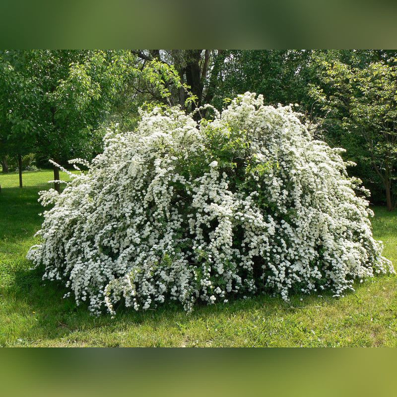 Спирея «Вангутта» (Spiraea × vanhouttei) - это крупный листопадный кустарник с раскидистой, дугообразной кроной, достигающий до 2-2,5 м в высоту и ширину. Ветви свисают вниз, придавая растению каскадный вид. Листья тёмно-зелёные, обратнояйцевидные, по краям зубчатые, длиной около 4-6 см. Осенью они приобретают жёлтые и оранжевые оттенки. В мае-июне куст покрывается белыми соцветиями, собранными в щитковидные кисти. Цветы мелкие, но собраны в плотные гроздья. Плоды у спиреи - это небольшие коробочки, созревающие в конце лета или начале осени. Они не представляют декоративной или пищевой ценности и чаще всего остаются незамеченными.