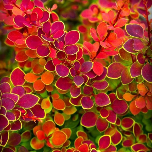 Барбарис «Оранж Санрайз» - высокий кустарник, достигающий до 1,5 метров в высоту. Ветки немного красноватые, прямые, длинные. Крона округлая, широкая. Листья окрашены в темно-красный и ярко-оранжевый оттенки. Цветет очень густо, но мало по срокам – меньше месяца. Плоды – ягоды, появляются осенью, овальные, красные, на вкус – горькие.