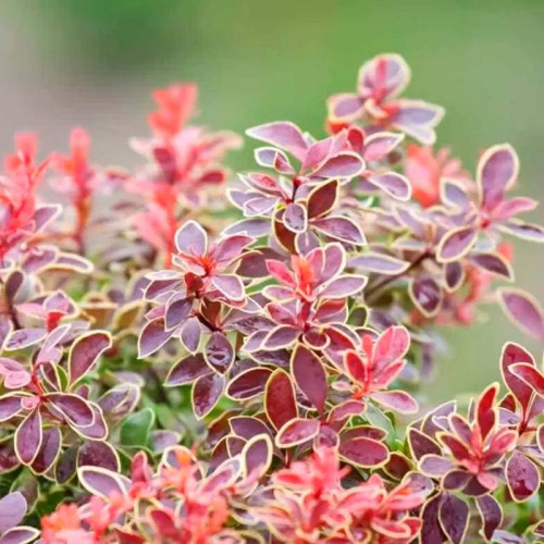 Барбарис Тунберга Старбест (Berberis thunbergii 'Starburst') — живописный листопадный кустарник, который ценится за необыкновенную пеструю окраску листвы, создающую эффект искрящегося фейерверка в саду. Этот сорт формирует компактную, округлую крону высотой и диаметром 50–60 см. Побеги прямостоячие, густо разветвленные, с характерными для барбариса тонкими колючками. Листья мелкие, лопатчатые. Их окраска – главное достоинство сорта: на одном кусте одновременно сочетаются ярко-розовые, сливочно-белые и насыщенно-зеленые оттенки. Молодой прирост часто имеет розово-коралловый цвет, а зрелые листья покрыты эффектным мраморным рисунком из бело-кремовых и зеленых пятен и мазков. Осенью палитра меняется на розово-пурпурные и алые тона. Цветение в конце весны скромное: мелкие желтоватые цветки с красным оттенком. Осенью могут созревать овальные красные ягоды, дополняющие осеннюю декоративность.