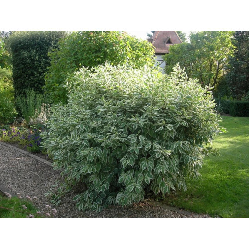 Дерен белый «Айвори Хало» (Cornus alba 'Ivory Halo') - декоративный кустарник, известный своей пестрой листвой и компактными размерами. Растение достигает около 1,5 метров в высоту и ширину и образует густую, округлую крону. Листья у сорта светло-зеленые с широкой белой каймой по краям. Осенью листья приобретают розовато-красные оттенки, а ярко-красные побеги делают кустарник особенно привлекательным зимой.