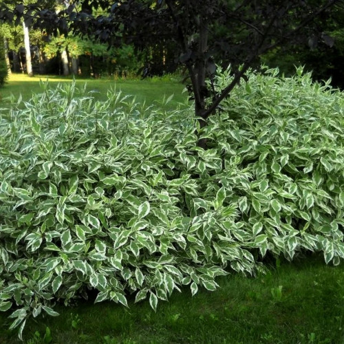Дерен белый «Сибирика Вариегата» - среднерослый кустарник, достигающий до 2 метров в высоту и ширину. Крона очень густая и раскидистая. Побеги коричневые, блестящие. Листья плоские, зеленые, с окаемкой белого оттенка. Соцветие шаровидное, цветки кремово-зеленые. Плоды - мелкие, округлые ягоды белого или голубоватого цвета, созревающие в августе-сентябре. Плоды несъедобны для человека, но часто привлекают пти.