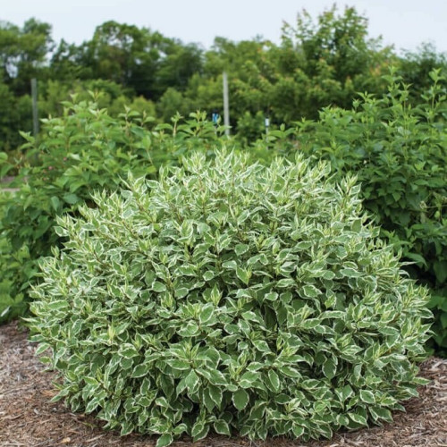 Дерен белый «Элегантиссима» (Cornus alba 'Elegantissima') - это декоративный кустарник, известный своими яркими листьями и привлекательной корой. Растение достигает 2,5-3 метров в высоту и имеет раскидистую крону с густыми ветвями. Листья крупные, овальной формы, ярко-зеленые с широкой белой каймой. Осенью листья приобретают желтовато-розовый оттенок. Красные ветви, особенно заметные зимой, добавляют кустарнику привлекательности в любое время года.