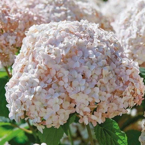 Гортензия древовидная «Кандибелле Маршмеллоу» (Hydrangea arborescens «Candybelle Marshmallow») - это декоративный кустарник с крупными пушистыми соцветиями нежно-розового цвета, напоминающими воздушные зефирки. Куст достигает в высоту около 1-1,2 м, имеет округлую и компактную форму. Крупные овальные листья насыщенного зелёного цвета создают красивый контраст с нежными розовыми соцветиями. Соцветия «Кандибелле Маршмеллоу» плотные, полусферической формы, достигают в диаметре 20-25 см. По началу цветки имеют светло-розовый оттенок, а по мере созревания белеют. Цветение длится с июня по октябрь.