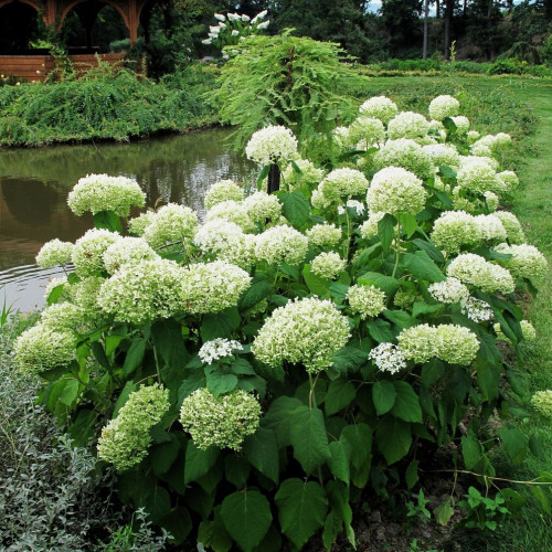 Гортензия древовидная «Стерилис» (Hydrangea arborescens «Sterilis») - это кустарник, известный своими крупными чисто-белыми соцветиями, напоминающими пышные снежные шары. Куст достигает в высоту от 1,5 до 2 метров и имеет раскидистую, густую форму. Листья у растения крупные, зелёные, овальной формы, с зубчатыми краями. Соцветия округлой формы, плотные, могут достигать в диаметре 20-25 см. По началу цветки имеют зеленоватый оттенок, затем становятся чисто-белыми и сохраняют этот цвет до конца цветения. Цветение длится с июня по сентябрь.