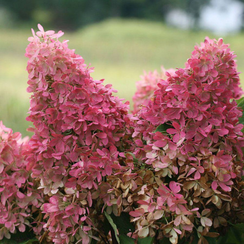 Гортензия метельчатая «Долли» (Hydrangea paniculata 'Dolly') — популярный и неприхотливый сорт метельчатой гортензии, который ценится за обильное и продолжительное цветение, крупные конусовидные соцветия, меняющие окраску, и за прочную, компактную форму куста. Этот сорт формирует вертикальный, густой куст высотой 1,5–2 м с крепкими, прямыми побегами тёмно-красного цвета, которые хорошо удерживают тяжёлые соцветия. Листья тёмно-зелёные, яйцевидные, с шероховатой поверхностью и мелкозубчатым краем. Главная декоративная особенность сорта — крупные, плотные, пирамидальные соцветия длиной 25–35 см, состоящие из смеси стерильных и фертильных цветков. В начале цветения (с середины июля) они имеют кремово-белую окраску с лёгким зеленоватым оттенком, затем постепенно становятся чисто белыми, а к концу лета и осени приобретают нежно-розовые, а затем насыщенные розово-малиновые тона. Цветение очень обильное, начинается в июле и длится до сентября. Соцветия долго сохраняются на кусте, украшая сад даже зимой.