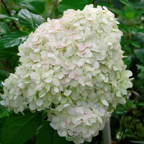 Гортензия метельчатая Харис Сувенир (Hydrangea paniculata 'Harry’s Souvenir') — изящный и компактный листопадный кустарник, который ценится за обильное и продолжительное цветение, а также за привлекательную, густую форму кроны. Этот сорт образует аккуратный, хорошо разветвленный куст высотой 1,5 –2 м с крепкими вертикальными побегами бордового оттенка. Листья эллиптические, темно-зеленые, с мелкозубчатым краем, создающие контрастный фон для светлых соцветий. Главная декоративная особенность сорта — крупные, ажурные, конические соцветия длиной 25–35 см, состоящие из смеси мелких фертильных и крупных стерильных цветков. В начале цветения (с июля) соцветия имеют нежный кремово-белый или зеленоватый оттенок, который постепенно переходит в чистый белый, а к концу лета и осени приобретает нежно-розовые и сиренево-розовые тона. Цветение очень обильное и длительное, с июля по октябрь, при этом соцветия источают легкий приятный аромат.