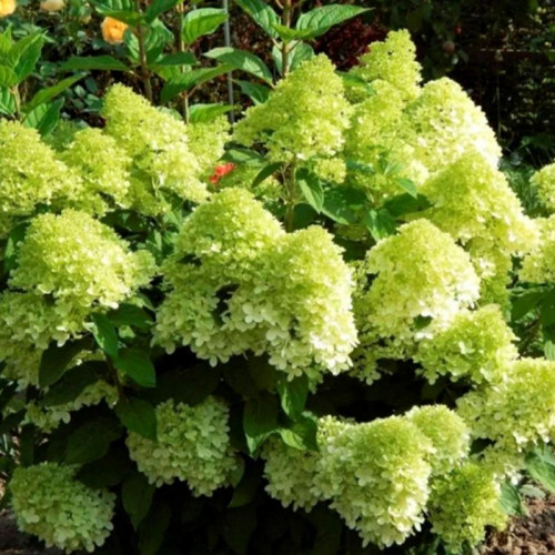 Гортензия метельчатая Пантонелла (Hydrangea paniculata 'Pantothenella') — нарядный и выносливый листопадный кустарник, который ценится за продолжительное и эффектное цветение, а также за элегантную, аккуратную форму куста. Этот сорт формирует компактный, вертикально растущий куст высотой 0,8–1 мс прочными, прямыми побегами темно-красного оттенка, которые хорошо держат форму даже под тяжестью крупных соцветий. Листья овально-эллиптические, насыщенно-зеленые, с выраженным жилкованием и мелкозубчатым краем, создающие выразительный контраст с нежными цветками. Главная декоративная особенность сорта — крупные, пышные, ширококонические соцветия длиной 20–30 см, состоящие преимущественно из стерильных цветков. В начале цветения (с июля) они окрашены в зеленый цвет, к осени переходящий в нежно-розовый. Цветение очень обильное, начинается в середине лета и длится до поздней осени, при этом засохшие соцветия сохраняются на кусте, украшая зимний пейзаж.