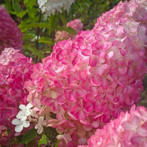 Гортензия метельчатая «Пинк Энд Роуз» (Hydrangea paniculata 'Pink and Rose') – популярный декоративный сорт гортензии, который высоко ценится за необычную двухцветную окраску соцветий и продолжительное цветение. Это листопадный кустарник, достигающий во взрослом состоянии высоты 1-1,3 м при диаметре кроны 1,2-1,5 м, образуя раскидистую, округлую форму. Соцветия крупные (длиной 25-30 см), конические, плотные, состоящие из многочисленных стерильных цветков, которые меняют окраску в течение сезона – от кремово-белых с зеленоватыми кончиками в начале цветения до нежно-розовых с насыщенными розово-малиновыми краями в полном роспуске. Листья темно-зеленые, яйцевидной формы, с бархатистой поверхностью, осенью приобретают пурпурные оттенки.