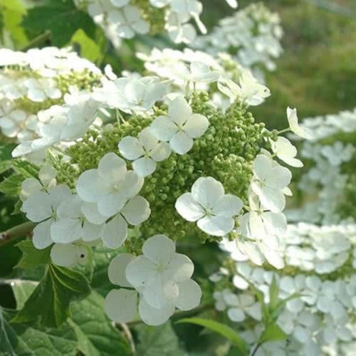 Гортензия «Пи Ви» (Pee Wee) – популярный компактный сорт дуболистной гортензии, который высоко ценится за изысканную форму листьев, эффектное цветение и яркую осеннюю окраску. Это листопадный кустарник, достигающий во взрослом состоянии высоты 1-1,5 м при диаметре кроны 0,9-1,2 м, образуя аккуратную, округлую форму. Листья крупные, напоминающие листья дуба, темно-зеленые, осенью приобретают насыщенные бордово-пурпурные оттенки. Соцветия конические, крупные (длиной 10-15 см), состоящие из многочисленных белых стерильных цветков, которые постепенно розовеют к осени.