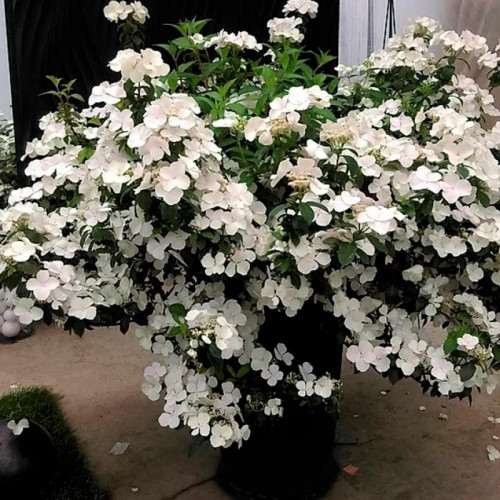 Гортензия «Сбежавшая невеста» (Hydrangea 'Runaway Bride') – изысканный сорт гортензии, который ценится за невероятно обильное и продолжительное цветение, а также изящную каскадную форму куста. Это листопадный кустарник, достигающий высоты 50-60 см с живописно поникающими побегами, образующими цветочный каскад длиной до 1,5 м. Листья яйцевидные, темно-зеленые, с пильчатым краем, создающие идеальный фон для многочисленных соцветий. Главная особенность сорта – обильное образование цветков не только на концах, но и по всей длине побегов. Чисто-белые стерильные цветки собраны в изящные ажурные соцветия диаметром 15-20 см, которые постепенно приобретают нежно-розовый оттенок к концу сезона. Цветение продолжается с июня по сентябрь.