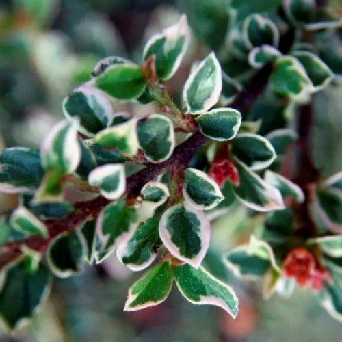 Кизильник горизонтальный «Вариегата» (Cotoneaster horizontalis 'Variegatus') – популярный декоративный сорт кизильника, который высоко ценится за пеструю листву и живописную стелющуюся форму роста. Это листопадный кустарник, достигающий во взрослом состоянии высоты 0,2-0,3 м при диаметре кроны 1-1,2 м, формирующий плотный, распростертый ковер с характерными горизонтальными ярусами ветвей. Листья мелкие, округлые, темно-зеленые с кремово-белой каймой, осенью приобретают розовые и пурпурные оттенки. Цветки мелкие, розовато-белые, одиночные или парные, появляются в июне. Плоды – ярко-красные шаровидные ягоды, сохраняются на ветвях до глубокой осени.