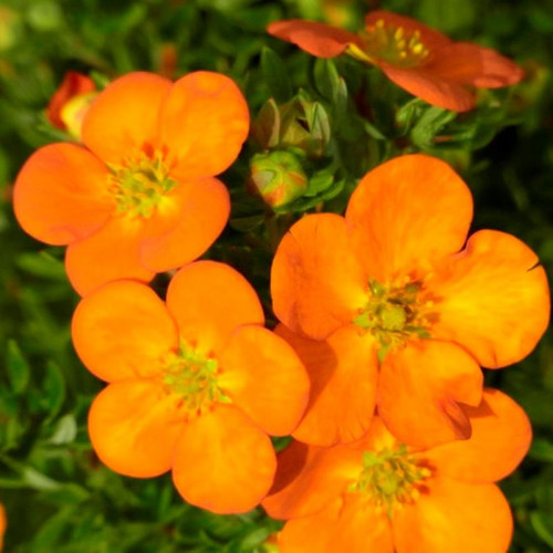 Лапчатка кустарниковая «Оранжиссима» (Potentilla fruticosa 'Orangeissime') – яркий сорт лапчатки, который ценится за необычную оранжево-желтую окраску цветков и продолжительное цветение. Это листопадный кустарник достигает высоты 0,5 м с компактной округлой кроной диаметром 0,9-1,2 м. Листья перистые, состоят из 5-7 мелких листочков, серебристо-зеленого цвета с характерным опушением. Главная особенность сорта – многочисленные цветки диаметром 3-4 см насыщенного оранжево-желтого цвета с золотистым оттенком в центре и шелковистой текстурой лепестков. Цветение обильное, покрывающее весь куст ярким оранжевым покрывалом, наступает в июне и продолжается до сентября.