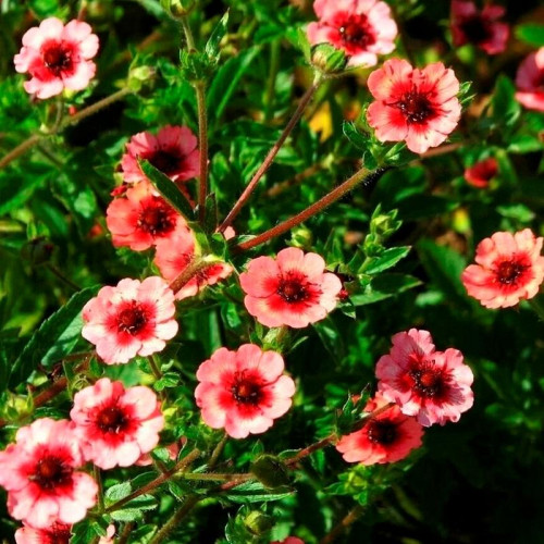 Лапчатка непальская (Potentilla nepalensis) – изящный многолетник, который ценится за продолжительное цветение и нежные изысканные цветки. Это травянистое растение образует раскидистые куртины высотой 30-60 см с ветвистыми стеблями. Листья пальчато-сложные, темно-зеленые с сизым оттенком, состоят из 5-7 зубчатых листочков. Главная особенность вида – многочисленные цветки диаметром 2,5-3 см нежно-розового или лососево-красного цвета с темно-малиновым глазком в центре. Цветки собраны в рыхлые метельчатые соцветия. Цветение продолжительное – с июня по август, длится 8-10 недель.