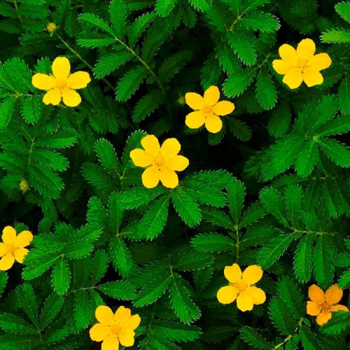 Лапчатка желтая (Potentilla) – изящный многолетник, который ценится за продолжительное цветение и яркие солнечные цветки. Это травянистое растение образует плотные кустики высотой 30-60 см с многочисленными ветвистыми стеблями. Листья пальчато-сложные, состоят из 5-7 продолговатых листочков, насыщенно-зеленого цвета с легким серебристым опушением. Главная особенность вида – многочисленные ярко-желтые цветки диаметром 2-3 см, собранные в рыхлые щитковидные соцветия. Цветение невероятно продолжительное – с июня по сентябрь, создающее эффект золотистого покрывала.