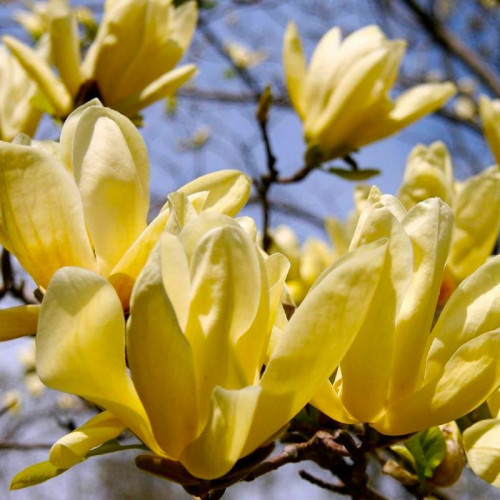 Магнолия «Еллоу Лантерн» (Magnolia 'Yellow Lantern') – уникальный сорт магнолии, который ценится за редкую желтую окраску цветков и изысканную форму кроны. Это листопадное дерево или крупный кустарник, достигающий высоты 3-5 м с пирамидальной кроной диаметром 3-4 м. Главная особенность сорта – крупные тюльпановидные цветки диаметром 10-15 см нежного лимонно-желтого цвета, появляющиеся до распускания листьев в апреле-мае. Цветы обладают легким цитрусовым ароматом и сохраняют декоративность в течение 2-3 недель. Листья крупные, обратнояйцевидные, темно-зеленые с глянцевой поверхностью, осенью приобретают золотисто-желтые оттенки.