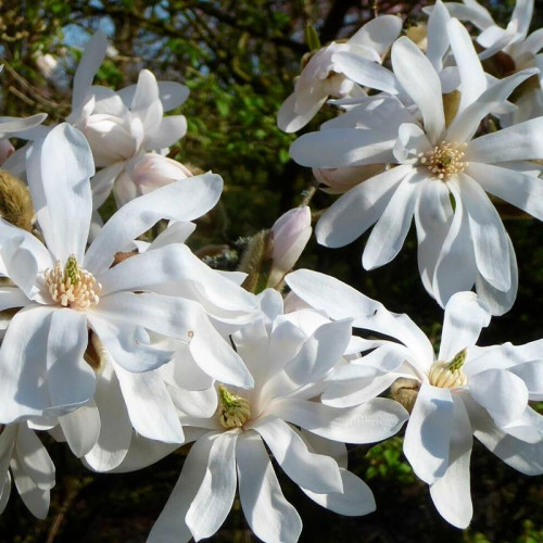Магнолия звездчатая «Стеллата» (Magnolia stellata 'Stellata') – изысканный декоративный кустарник, который ценится за обильное ранневесеннее цветение и изящную форму кроны. Это листопадное растение достигает высоты 2-2,5 м с округлой, густоветвистой кроной диаметром 2-3 м. Кора молодых побегов имеет оливково-серый оттенок с серебристым налетом, с возрастом становится светло-коричневой с выразительными чечевичками. Главная особенность сорта – многочисленные звездчатые цветки диаметром 8-12 см с 12-18 узкими лентообразными лепестками чисто-белого цвета, появляющиеся до распускания листьев в апреле. Цветы источают тонкий, нежный аромат. Листья узкоэллиптические, темно-зеленые, длиной 5-10 см, осенью приобретают золотисто-бронзовые оттенки.