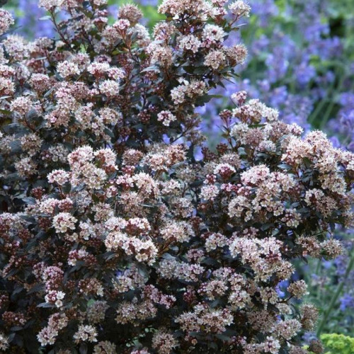 Пузыреплодник калинолистный «Литтл Джокер» (Physocarpus opulifolius 'Little Joker') – компактный листопадный кустарник, который ценится за миниатюрные размеры и контрастную окраску листвы. Это карликовое растение достигает высоты 0,9-1 м при диаметре кроны 0,7-0,9 м, формирует плотную подушковидную форму. Листья трехлопастные, при распускании насыщенного пурпурно-красного цвета, летом становятся свекольно-пурпурными, а осенью приобретают шоколадно-бордовые оттенки. Побеги вертикальные, растут плотно. В июне появляются мелкие бело-розовые цветки, собранные в щитковидные соцветия, которые осенью сменяются красноватыми вздутыми плодами-листовками.