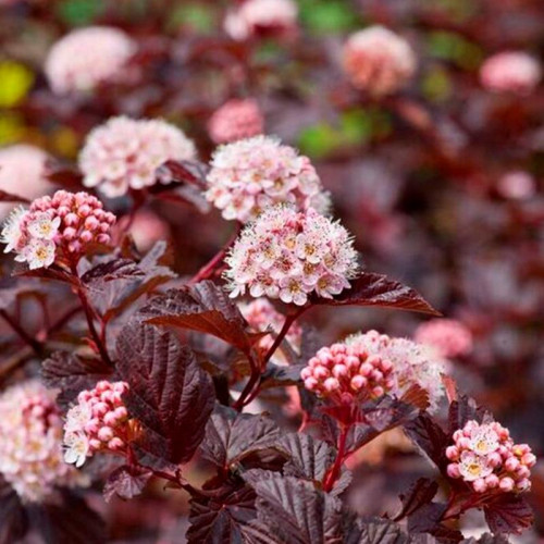 Пузыреплодник «Саммер Вайн» (Physocarpus opulifolius 'Summer Wine') – популярный декоративный сорт пузыреплодника, который высоко ценится за изящную винно-красную листву и компактную форму куста. Это листопадный кустарник, достигающий во взрослом состоянии высоты 1,5-2 м при диаметре кроны 1,2-1,5 м, формирующий вазообразную, ажурную форму с изящно поникающими ветвями. Листья трех-пятилопастные, глубоко рассеченные, насыщенного винно-красного цвета с пурпурным оттенком, сохраняют интенсивную окраску в течение всего сезона, осенью приобретают бронзовые тона. Цветки многочисленные, нежно-розовые, собраны в плотные щитковидные соцветия диаметром 3-5 см, появляются в июне-июле.