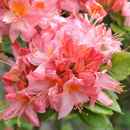 Рододендрон листопадный (Азалия) «Пинк Делайт» (Rhododendron 'Pink Delight') – невероятно эффектный листопадный кустарник, который ценится за крупные нежно-розовые соцветия и изысканную форму цветков. Это среднерослое растение достигает высоты 1,3 м с раскидистой, хорошо разветвленной кроной диаметром 1,3-1,6 м. Листья эллиптические, длиной 7-12 см, летом насыщенно-зеленые с глянцевой поверхностью, осенью приобретают живописные оранжево-багряные оттенки. Главная особенность сорта – крупные шаровидные соцветия диаметром 12-15 см, состоящие из 10-14 изящных воронкообразных цветков нежного розово-перламутрового оттенка с золотисто-оранжевым крапом в зеве. Цветки диаметром 6-7 см имеют легкий сладковатый аромат и волнистые края лепестков. Цветение обильное, наступает в конце мая – июне и длится 3-4 недели.