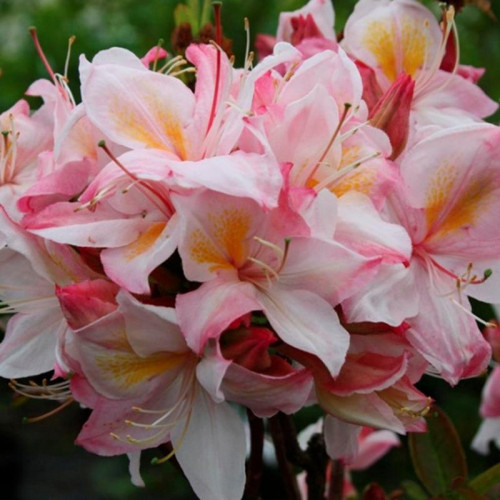Рододендрон листопадный (Азалия) «Сатоми» (Rhododendron 'Satomi') – изысканный листопадный кустарник, который ценится за нежную окраску цветков и обильное продолжительное цветение. Это раскидистое растение достигает высоты 1,2-1,5 м при диаметре кроны 1,5-1,8 м. Листья ланцетные, длиной 5-8 см, светло-зеленые с легким опушением, осенью приобретают насыщенные желто-оранжевые тона. Главная особенность сорта – крупные соцветия диаметром 10-12 см, состоящие из 8-12 нежно-розовых цветков с коралловым оттенком и золотистым крапом в зеве. Цветки диаметром 5-6 см имеют воронкообразную форму и легкий тонкий аромат. Цветение обильное, наступает в конце мая – июне и продолжается 3-4 недели.