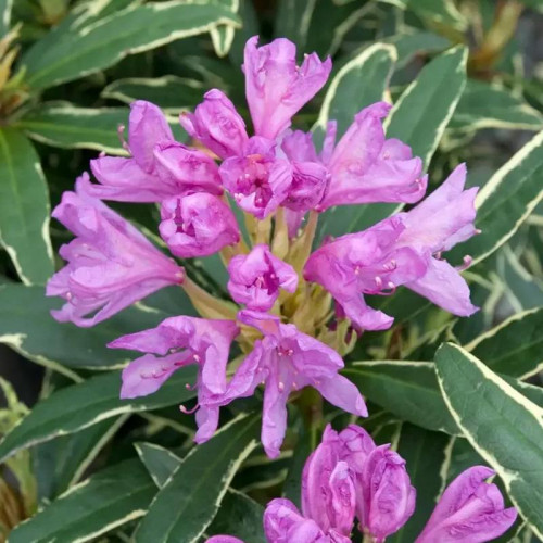 Рододендрон «Вариегатум» (Variegatum) – популярный вечнозеленый сорт рододендрона, который высоко ценится за роскошное цветение и эффектную пестролистность. Это мощный кустарник, достигающий во взрослом состоянии высоты 1,5 м при диаметре кроны 1,5-1,8 м, образуя раскидистую, подушковидную форму. Листья кожистые, эллиптические, темно-зеленые с кремово-белой неравномерной каймой, сохраняют декоративность круглый год. Цветки крупные (диаметром 6-7 см), воронкообразные, нежно-сиреневые с оливково-зеленым крапом на верхнем лепестке, собраны в плотные шаровидные соцветия по 12-15 цветков.
