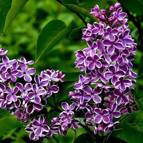 Сирень обыкновенная «Сенсация» - это один из самых уникальных и эффектных сортов сирени, отличающийся двухцветными цветками. Цветы этого сорта имеют насыщенно-фиолетовые лепестки с ярко-белой каймой по краю, что создаёт необычный контраст и придаёт растению особую декоративную ценность. Соцветия большие, конусообразные, густо покрывают куст в период цветения. Листья у сирени «Сенсация» тёмно-зелёные, сердцевидные, плотные, что создаёт густую, объёмную крону, которая сохраняет декоративность в течение всего сезона. В высоту Куст может достигать 3-4 м в высоту. Крона растения широкая и раскидистая.