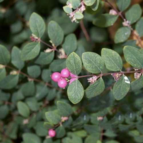 Снежноягодник Доренбоза «Мэджикал Берри Крисмас» – это настоящий праздничный подарок для зимнего сада, создающий волшебную атмосферу своими крупными розово-малиновыми плодами, которые как новогодние игрушки украшают куст с осени до весны. Этот эффектный сорт формирует компактный куст высотой 1,2-1,5 м с изящными дугообразными побегами, образующими живописный фонтан диаметром до 1,8 м, где каждая ветвь превращается в праздничную гирлянду из плодов. Листья насыщенного темно-зеленого цвета с легким бронзовым отливом, овально-заостренной формы длиной 4-5 см, осенью вспыхивают огненными красками – от золотисто-оранжевых до пурпурно-красных, создавая потрясающий контраст с яркими ягодами, а в мягкие зимы частично сохраняются на ветвях, усиливая декоративный эффект.