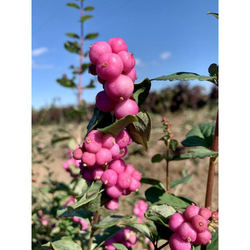 Главная гордость сорта – необычные для снежноягодника плоды: крупные (1-1,2 см в диаметре) шаровидные ягоды розового цвета с перламутровым отливом, собранные в плотные кисти по 15-20 штук, которые в августе-сентябре полностью скрывают ветви, создавая впечатление розовой пены. По мере созревания ягоды приобретают более насыщенный кораллово-розовый оттенок, а к зиме становятся рубиново-розовыми, сохраняясь на кусте до марта, даже под снежным покровом. Цветение в июне-июле выглядит скромно, но изысканно – мелкие колокольчатые цветки бледно-розового цвета с медовым ароматом густо покрывают побеги, привлекая пчел и бабочек.