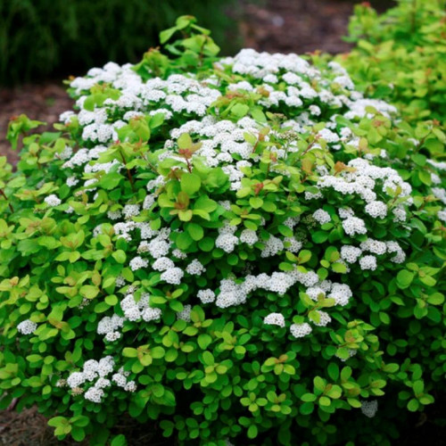 Спирея березолистная «Тор Голд» – яркий декоративный кустарник, который ценится за необыкновенно эффектную окраску листвы и компактную форму. Это невысокий листопадный кустарник, достигающий во взрослом состоянии высоты 0,6-0,7 м при диаметре кроны до 1 м, образуя плотный, подушковидный куст. Листья мелкие, изящные, округлой формы с мелкозубчатым краем, весной яркого лаймово-желтого цвета, летом приобретают золотисто-желтый оттенок, а осенью вспыхивают огненно-оранжевыми и медными тонами. В начале лета куст покрывается многочисленными мелкими белыми цветками, собранными в плотные щитковидные соцветия, которые эффектно контрастируют с золотистой листвой.
