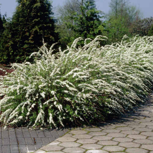 обильными белыми цветами и элегантной формой кроны. Этот сорт достигает до 1,5-2 м в высоту и около 2 м в ширину. Ветви кустарника длинные, гибкие,