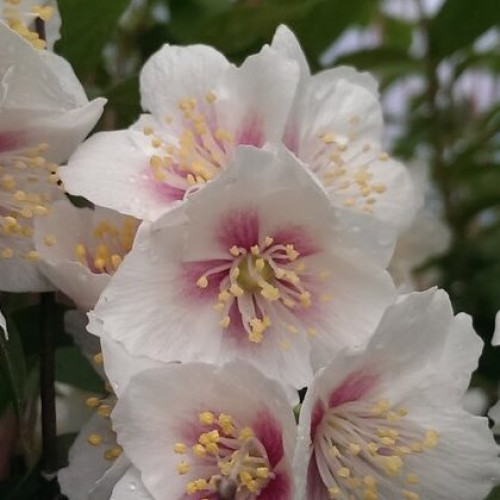 Жасмин (чубушник) «Биколор» - среднерослый декоративный кустарник, высотой до 2 м. Его темно-зеленые овальные листья создают густую крону, летом куст покрывается полумахровыми или махровыми цветками диаметром 4-5 см. Особенность данного сорта - белые лепестки с эффектными розовыми или малиновыми мазками, придающими цветению необычный вид. Аромат нежный, сладкий, с ванильно-фруктовыми нотками. Цветет в июне-июле.