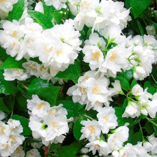 Жасмин «Монблан» (Philadelphus 'Mont Blanc') – популярный декоративный сорт чубушника, который высоко ценится за обильное цветение и крупные белоснежные цветки. Это листопадный кустарник, достигающий во взрослом состоянии высоты 1,2-1,8 м при диаметре кроны 1-1,2 м, образующий компактную, раскидистую форму с изящно изогнутыми побегами. Листья яйцевидные, темно-зеленые, с мелкозубчатым краем, длиной 4-6 см. Цветки крупные (диаметром 3-4 см), чисто-белые, полумахровые, собраны в плотные кистевидные соцветия по 5-7 штук. Обладают нежным, сладковатым ароматом с земляничными нотками. Период цветения – июнь-июль, продолжительность – 25-30 дней.