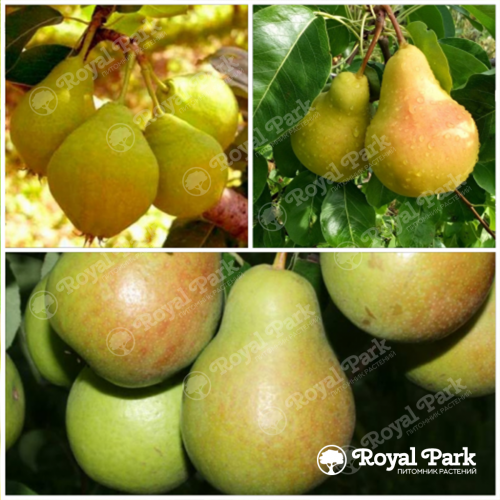Дерево-сад Груша Чижовская (с прививками Лада и Детская) - уникальное многосортовое растение, объединяющее три популярных сорта груш на одном штамбе. Дерево достигает 4-5 м в высоту, имеет пирамидальную крону средней густоты, где в качестве основного подвоя выступает зимостойкая Чижовская, а в скелетные ветви привиты раннеспелая Лада и ультраранняя Детская. Листья различаются по сортам: у Чижовской они среднего размера, овально-заостренные, темно-зеленые с глянцевой поверхностью, у Лады - более округлые, светло-зеленые с нежным опушением, у Детской - некрупные, с характерной желтоватой жилковатостью. Плодоношение растянуто с начала августа (Детская) до конца августа (Чижовская), создавая непрерывный грушевый конвейер: Детская дает небольшие (60-80 гр) желтые с румянцем груши с нежной сладкой мякотью, Лада - средние (100-120 гр) светло-желтые плоды с кисло-сладким вкусом, Чижовская - крупные (120-140 гр) желто-зеленые груши с сочной маслянистой мякотью и тонким ароматом.