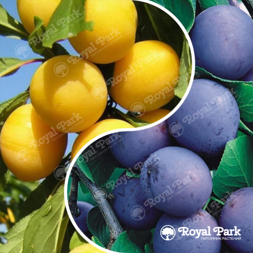 Дерево-сад Слива Конфетная (с прививками Желтая крупноплодная и Ренклод ранний) - уникальный плодовый гибрид, объединяющий три перспективных сорта слив на одном штамбе. Дерево достигает 3-4 м в высоту и имеет раскидистую округлую крону средней густоты, где в качестве основного подвоя выступает сладкоплодная Конфетная, а в скелетные ветви привиты урожайная Желтая крупноплодная и деликатесный Ренклод ранний. Листья различаются по сортам: у Конфетной они среднего размера, яйцевидные, насыщенно-зеленые с легким глянцем, у Желтой крупноплодной - более округлые, матовые, светло-зеленого оттенка, у Ренклода - крупные, удлиненные, с характерной морщинистой поверхностью и серебристым опушением нижней стороны. Плодоношение растянуто с конца июля (Конфетная) до середины августа (Ренклод ранний), что создает непрерывный сливовый конвейер: Конфетная дает некрупные (25-35 г) красно-фиолетовые плоды с медовой мякотью и карамельным послевкусием, Желтая крупноплодная - массивные (40-50 г) янтарно-желтые сливы с сочной кисло-сладкой мякотью, Ренклод ранний - округлые (30-40 г) зеленовато-желтые с восковым налетом плоды с нежной тающей мякотью и изысканным десертным вкусом.