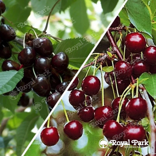 Дерево-сад Вишня Жуковская (с прививками Владимирская и Шоколадница) - уникальный многосортовой комплекс, сочетающий лучшие качества трех популярных сортов вишни на одном штамбе. Дерево достигает 3-4 м в высоту и имеет раскидистую округлую крону средней густоты, где каждая привитая часть сохраняет свои характерные особенности: основание (подвой) и центральный проводник формируются из зимостойкой Жуковской, боковые ветви представлены Владимирской (более темные листья и плоды) и Шоколадницей (компактный рост). Листья различаются по сортам - у Жуковской они крупные, темно-зеленые, удлиненно-овальные с заостренным кончиком, у Владимирской - более мелкие и округлые с матовой поверхностью, у Шоколадницы - среднего размера с характерным бронзовым оттенком молодой листвы. Плодоношение растянуто с середины июля (Жуковская) до начала августа (Шоколадница), при этом каждый сорт сохраняет свои уникальные характеристики плодов: Жуковская дает крупные (4-5 гр) темно-красные сердцевидные ягоды с нежной кисло-сладкой мякотью, Владимирская - более мелкие (2,5-3,5 рг), но исключительно ароматные плоды почти черного цвета, Шоколадница - среднего размера (3-3,5 гр) с характерным шоколадным оттенком кожицы и десертным вкусом.