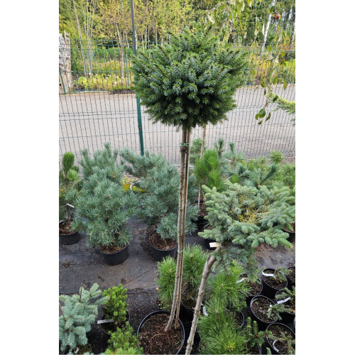 Ель обыкновенная «Барри» на штамбе (Picea abies 'Barryi') – редкий и высокодекоративный сорт ели с компактной шаровидной формой и густой структурой кроны. Это медленнорастущее хвойное растение, привитое на штамб высотой от 0,8 до 1,2 метра, формирующее плотную сферическую крону диаметром 0,8-2 м. Хвоя короткая (1-1,5 см), жёсткая, насыщенного тёмно-зелёного цвета с глянцевым блеском, расположена радиально. Молодые приросты весной имеют яркий салатово-зелёный оттенок, создавая красивый контраст со старой хвоей. Крона формируется очень плотной, симметричной, с короткими, направленными вверх побегами, которые с возрастом создают характерную "гнездовидную" форму.