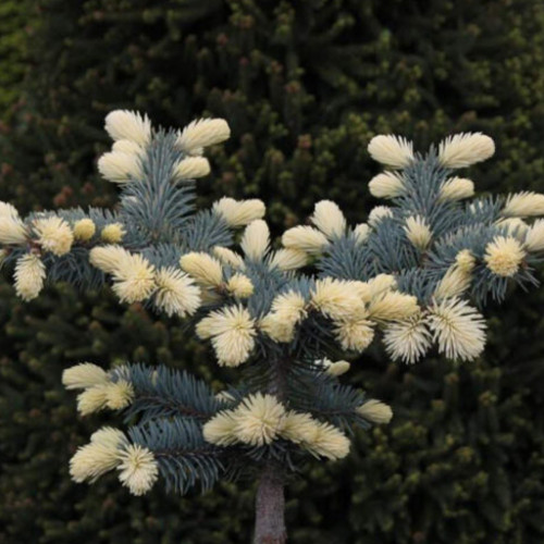 Ель колючая "Биалобок" - низкорослое хвойное дерево. Взрослое дерево к 30-ти годам достигает до 5 метров в высоту и около 2 метров в ширину. Растет очень медленно, годовой прирост всего 5-10 см. Крона ширококоническая, густая. Молодое дерево растет неправильной формы, без ярко-выраженного лидера. С годами ель выравнивается и приобретает классическую форму треугольника. Хвоя длинная и жесткая, голубого оттенка. Незрелые шишки зеленые, созревшие окрашиваются в красные тона. Самая главная отличительная черта - это белые приросты весной, которые украшают ель в течение двух недель.