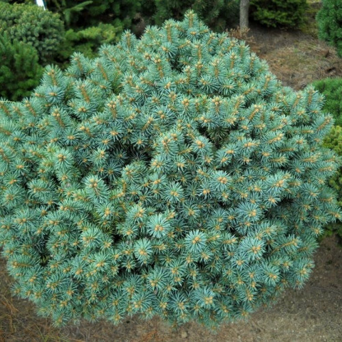 сорта от 200 лет. Высота и ширина взрослого растения достигает 1.2 м. Прирост в год всего около 2-3 см. Крона полусферической формы, компактная. Хвоя длиной до 2 см,