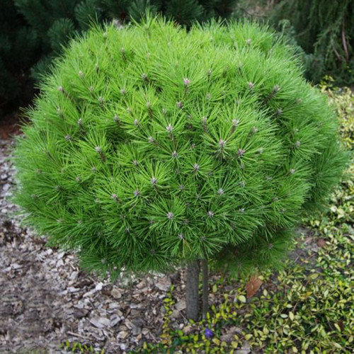 Сосна черная «Бамбино» (Гаелль Брегеон) - очаровательный карликовый сорт сосны, который ценится за исключительно компактные размеры и идеальную, подушкообразную форму кроны. Это крайне медленнорастущее растение, которое достигает во взрослом состоянии около 1,5 м в высоту при диаметре кроны до 1 м. Хвоя длинная, густая, колючая, насыщенного темно-зеленого цвета с глянцевым блеском, что создает эффектный контраст с более светлыми молодыми приростами. Крона очень плотная, от природы формирует аккуратную, симметричную сферу или невысокую подушку, не требующую формирующей обрезки.