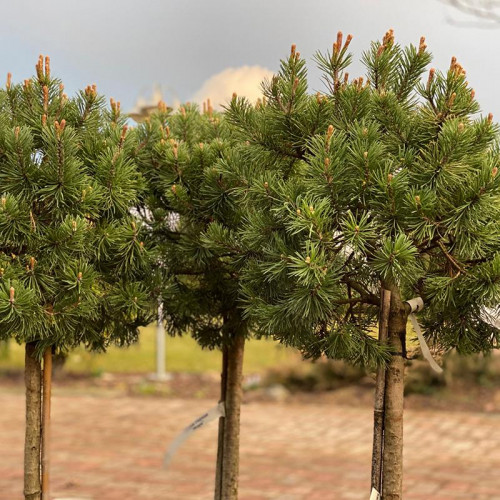 Сосна горная «Гном» на штамбе (Pinus mugo 'Gnom') – популярный карликовый сорт сосны, который высоко ценится за плотную шаровидную форму кроны и миниатюрные размеры. Это медленнорастущее хвойное растение, привитое на штамб высотой 0,6-1,0 м, достигающее во взрослом состоянии общей высоты 2,5 м при диаметре кроны 1,0-1,2 м, образуя идеальную шаровидную форму. Хвоя короткая (3-4 см), густая, темно-зеленого цвета, собрана в плотные пучки. Годовой прирост составляет 5-7 см, что делает растение идеальным для малых садов.